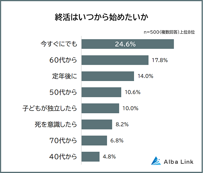 今回、株式会社AlbaLink( https://albalink.co.jp/ )が運営する空き家買取隊( https://akiya-kaitoritai.com/ )は、30代以上の男女500人を対象に「終活への取り組み」についてアンケート調査を実施しました。