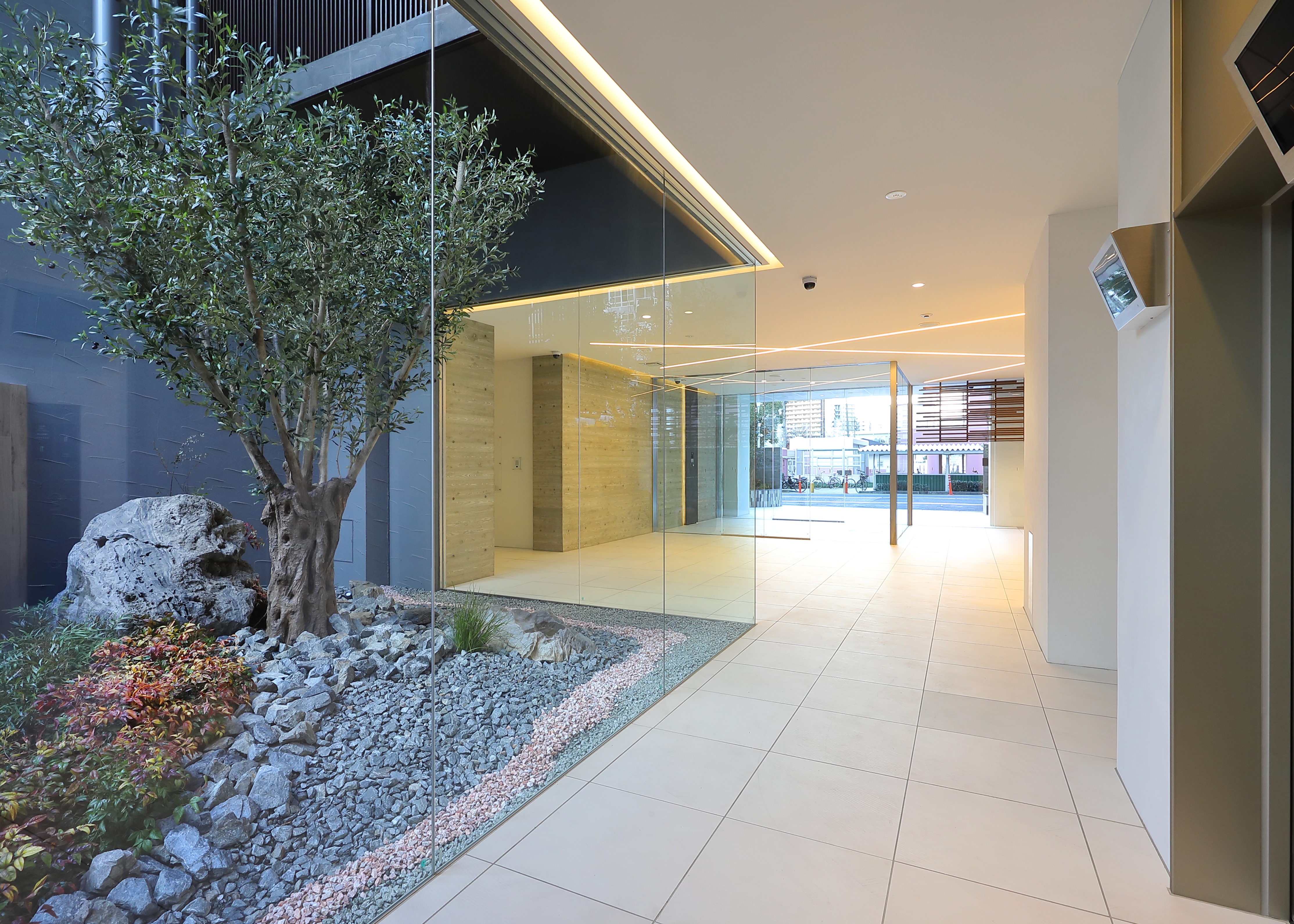外観・エントランスは高級感溢れるラグジュアリーで洗礼されたデザインに仕上げており、エントランスは安心感のある落ち着いた雰囲気を演出するため、坪庭を設けております。