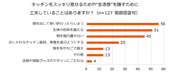 では、キッチンをスッキリ見せ、生活感をなくすにはどうすればよいのでしょうか?皆さんが実施している工夫の中で最も多かった回答(複数回答可)は、「物を出して使い終わったらしまう」(56回答)でした。次いで「全体の色味を揃える」(51回答)、「物を極力置かない」(45回答)と続き、「見せるキッチン」への意識の高さがうかがえました。「物を出して使い終わったらしまう」は基本的なことではありますが、習慣づけるのが難しいという方も多いかもしれません。よく使うものは取り出しやすいところに置くなど、収納から見直すこともポイントです。