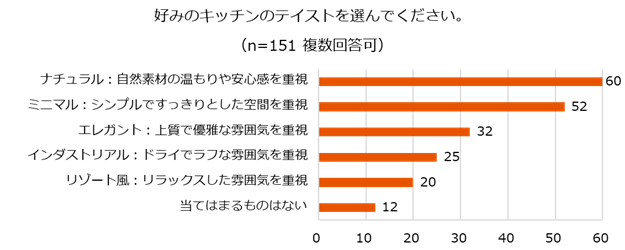 好みのキッチンのデザインテイストについて尋ねたところ(複数回答可)、「ナチュラル」(60回答)が最も多く、続いて「ミニマル」(52回答)、「エレガント」(32回答)となりました。木目など自然の素材感を活かした「ナチュラル」や、余計な装飾を省いてスッキリとした空間を演出する「ミニマル」は、キッチンだけでなく住空間全体にも取り入れやすいテイストです。トータルコーディネートでリビングになじむキッチンづくりを心がけると、理想のキッチンに近づけるかもしれません。