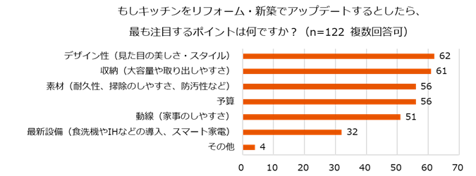 今後新築やリフォームでキッチンをアップデートする際、最も注目する項目を尋ねたところ(複数回答可)、「デザイン性(見た目の美しさ・スタイル)」(62回答)が最多となりました。次いで「収納(大容量や取り出しやすさ)」(61回答)、「素材(耐久性、掃除のしやすさ、防汚性など)」と「予算」が同列(56回答)、「動線(家事のしやすさ)」(51回答)、「最新設備(食洗機やIHなどの導入、スマート家電)」(32回答)と続き、デザインと機能性を両立させたいという傾向が浮き彫りになりました。