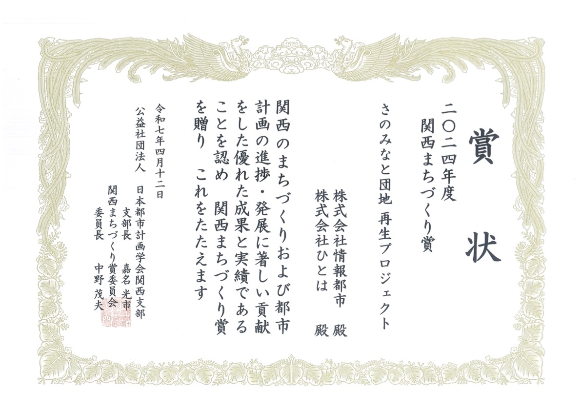 株式会社情報都市の団地再生プロジェクトが、公益社団法人 日本都市計画学会 関西支部が主催する「2024年度 第27回関西まちづくり賞」を受賞いたしました。