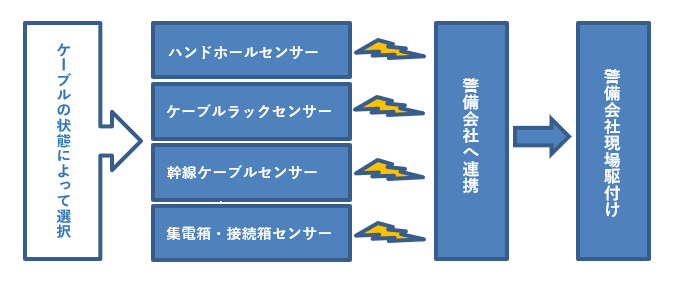 ケーブル盗難防止センサーの設置と、警備会社への自動通報・現場駆け付けをパッケージ提供します。