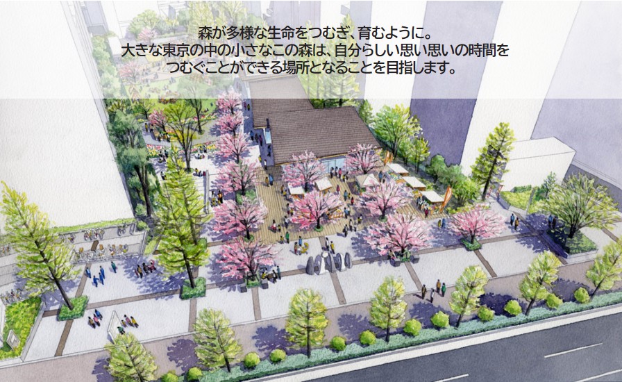 事業テーマに「つむぐ桜の森」を掲げ、桜をシンボルとした公園空間と、周辺エリアとの一体感をつむぎ「都心の森」をつくります。桜川公園を単なる公園空間としてではなく、地域の価値を高め、人々の暮らしを豊かにする、街の重要な社会インフラと考えております。この公園エリアを立体的に捉え、連続する緑のネットワークを形成します。