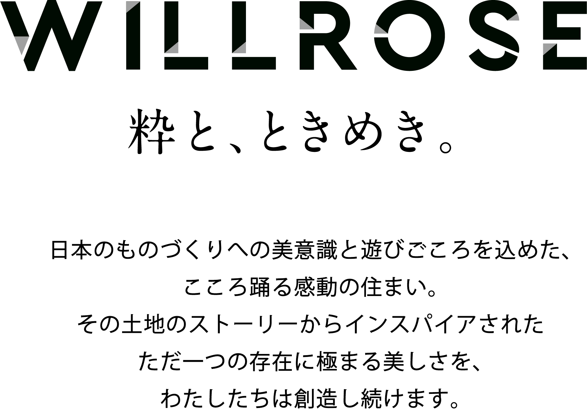 ブランドロゴに併記しておりますタグライン 『粋と、ときめき。』は、日本橋にルーツを持ち、 レジデンス開発を「東京」を中心としてここまで進んできたこと、ものづくりへの日本らしい美意識へのこだわりと遊び心を「粋」という言葉に込め、人をわくわくさせたいという想いとつながる「ときめき」という言葉を合わせ、WILLROSEブランドが大切にするマインド・スタンスを表現しています。