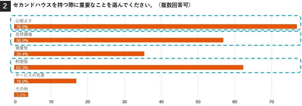 セカンドハウスの利用目的について、1位がリフレッシュのため(自然に親しむ)(64.6%)、2位が二拠点生活のため(都会と違う暮らし)(48.5%)と続いた。また、セカンドハウスにおいて、「心地よさ」「利便性」「自然環境」の3つが特に重要視されているポイントであるとわかった。
