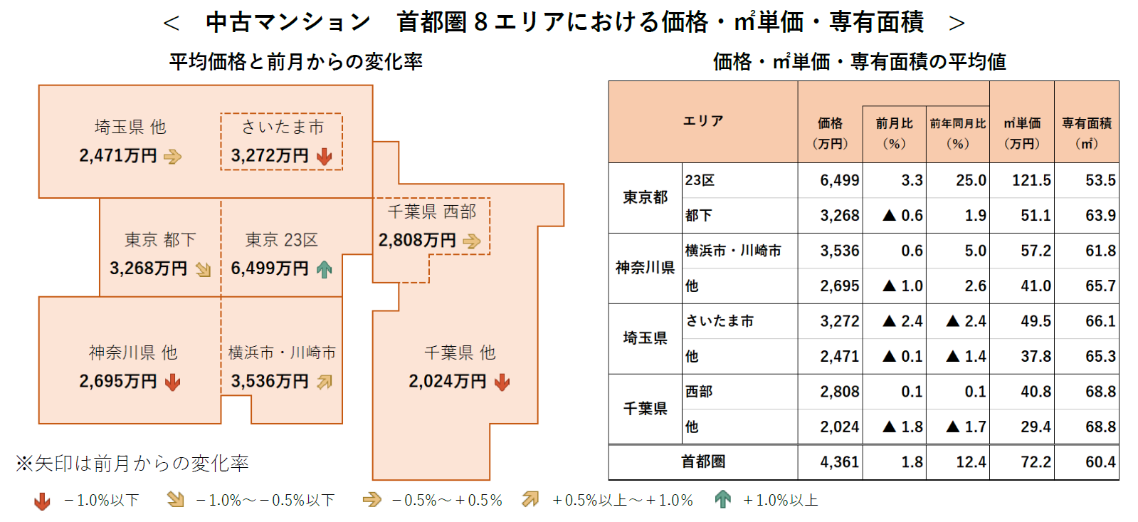 ●首都圏の中古マンション1戸あたり平均価格は4,361万円で、前月比は+1.8%、前年同月比は+12.4%といずれも8カ月連続で上昇。