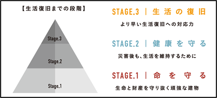旭化成ホームズグループは、不意の自然災害において命を守る(STAGE.1)だけでなく、健康を守り(STAGE.2)、生活の復旧(STAGE.3)までを見据えた「トータルレジリエンス(総合防災力)」を提唱しています。今回優秀賞を受賞した「HEBELHAUSトータルレジリエンス2.0」は、地震・火災・水害に加え、近年の平均気温の上昇による猛暑日の増加など、より厳しくなる自然災害に対応できるよう、3つのステージそれぞれを強化しています。