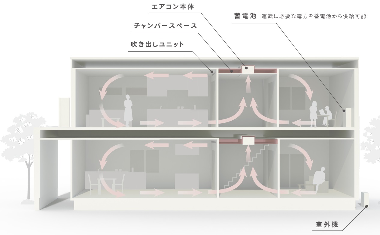 ロングライフ全館空調は「全館暖冷房システム」+「熱交換型ロングライフ・エコ換気システム」+「住環境シミュレーションシステムARIOS」で構成される独自のシステム(※7)です。本システムの採用により、居室はもちろん玄関ホールや廊下、水廻りに至るまで、家全体を快適な温度に保ちます。一人時間も重視する現代のご家族のライフスタイルに合わせ、家じゅうに心地よい居場所を創り出します。