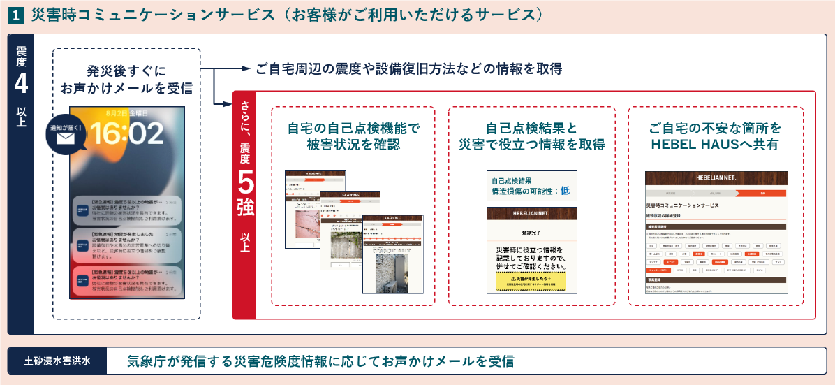 地震発生時(震度4以上)の発災直後と数時間のリマインドメールの2回にわたり、当社から会員制ネットクラブHEBELIAN NET.に登録されているお客様にお声かけメールが届きます。本サービス運用開始よりHEBELIAN NET.がアプリ化され、お声かけメールも携帯電話のPush通知に対応し、よりお客様への声かけが届きやすくなるようリニューアルしました。