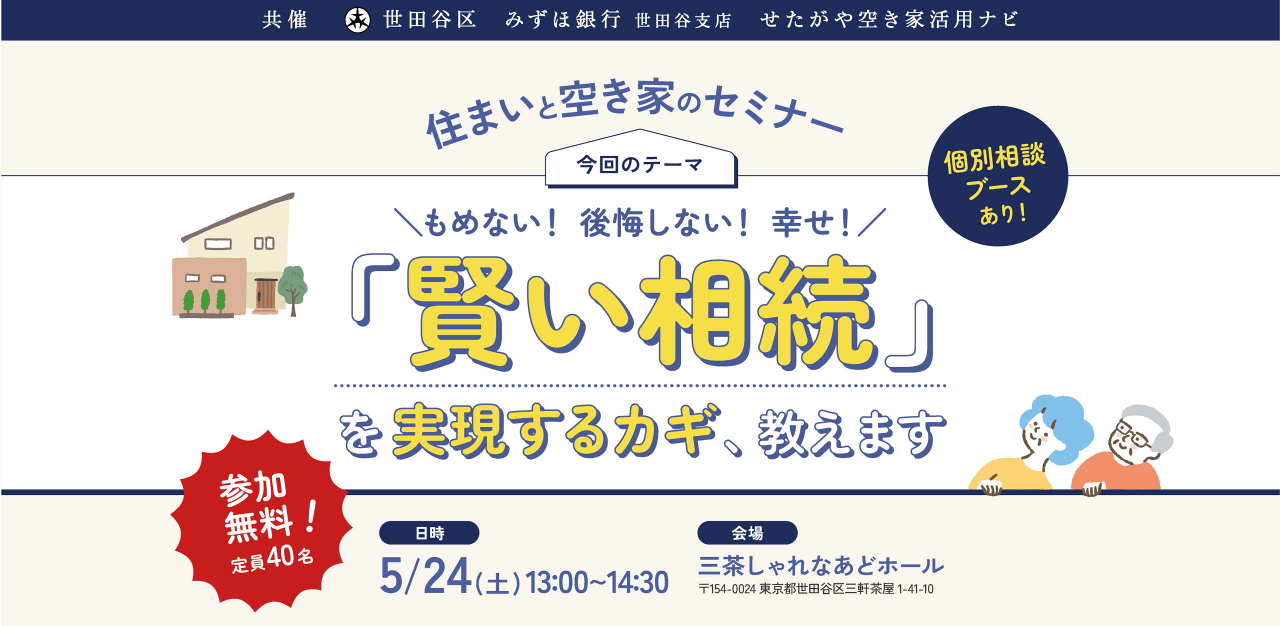 5/24(土)13:00〜14:30 三茶しゃれなあどホール。事前参加申し込み制、参加無料。個別の相談ができる簡易相談ブースも無料で予約可能。空き家にならないための対処を学んでみてください