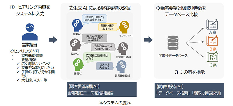 本システムはLLM(大規模言語モデル)※を利用した3つのAIから構成されています。営業担当がお客様の家族構成や住宅の好み、現在の住まいの悩みなどをヒアリングしてシステムに入力します(下図①)。「顧客要望深掘AI」がお客様の潜在的な要望を議論し示唆を出します(下図②)。その後「間取り検索AI」が検索し複数の間取り候補を選びます(下図③)。営業担当はAIが選んだ候補をベースにお客様に最適な間取りとライフスタイルがイメージできる提案をします。