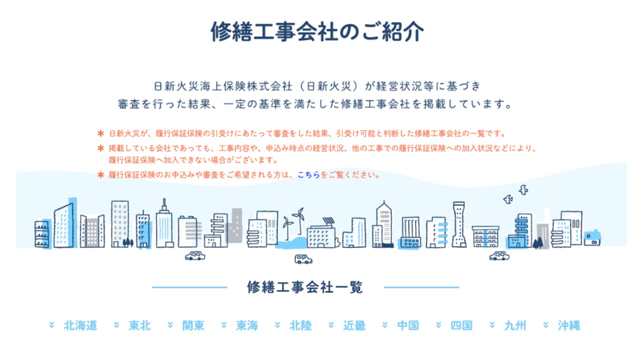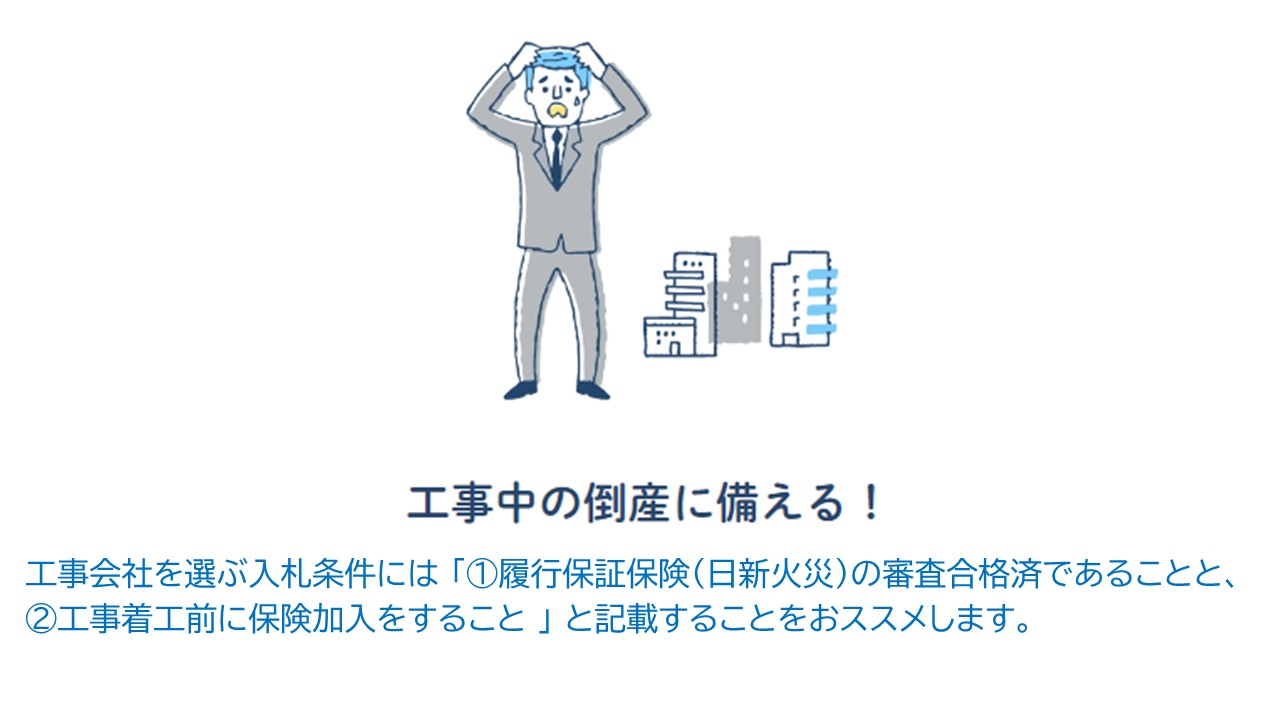 最後に、修繕工事会社を選ぶ入札条件には「日新火災の履行保証保険に加入すること」と記載することをおススメします。保険加入をリクエストすることで、履行保証保険への加入がスムーズに進みます。
