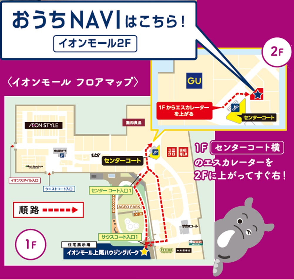 『おうちNAVI』は、イオンモール上尾1階センターコート横のエスカレーターを2階に上がってすぐ右手側にございます。お買い物ついでにもお気軽にお立ち寄りいただけます。