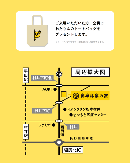 オープンキャンペーンで、ご来場いただいた方に、わたりんのオリジナルトートバックをプレゼントしております。是非一度、お越しください。
