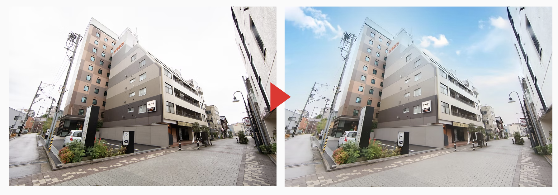 AIが空を自動判別し、自然な仕上がりで空を差し替えます。青空、夕暮れ、晴天など、複数のパターンから選択可能です。物件のイメージに合わせて最適な空を演出でき、外観写真をより魅力的に演出可能