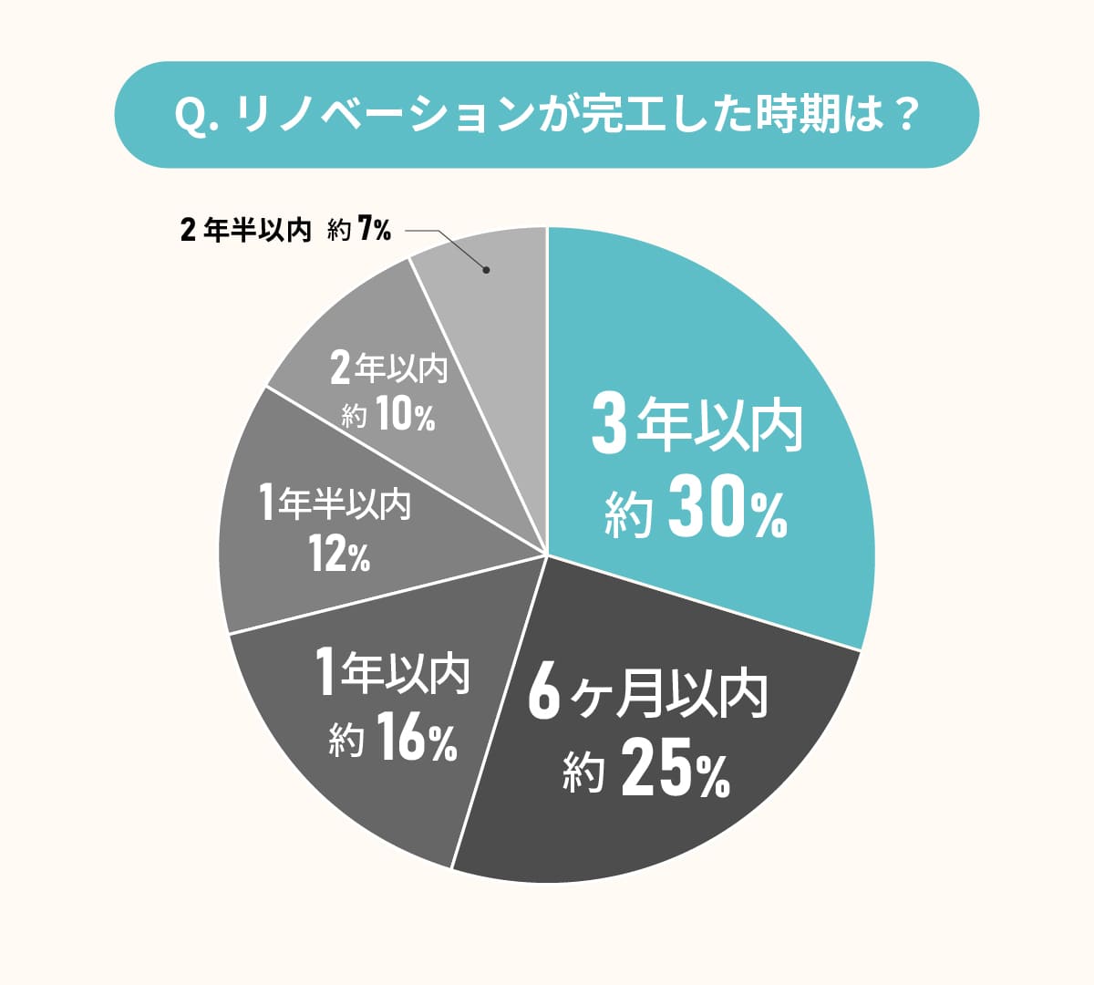 回答者に、リノベーションが完工した時期とかかった費用、依頼先について聞いてみました。