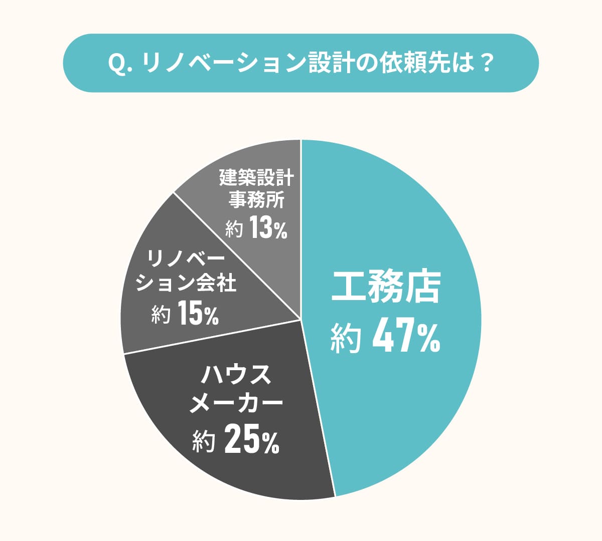 最も多かったのは、「工務店」の約47%でした。次いで「ハウスメーカー」が約25%、その他「リノベーション会社」「建築設計事務所」という人もいました。