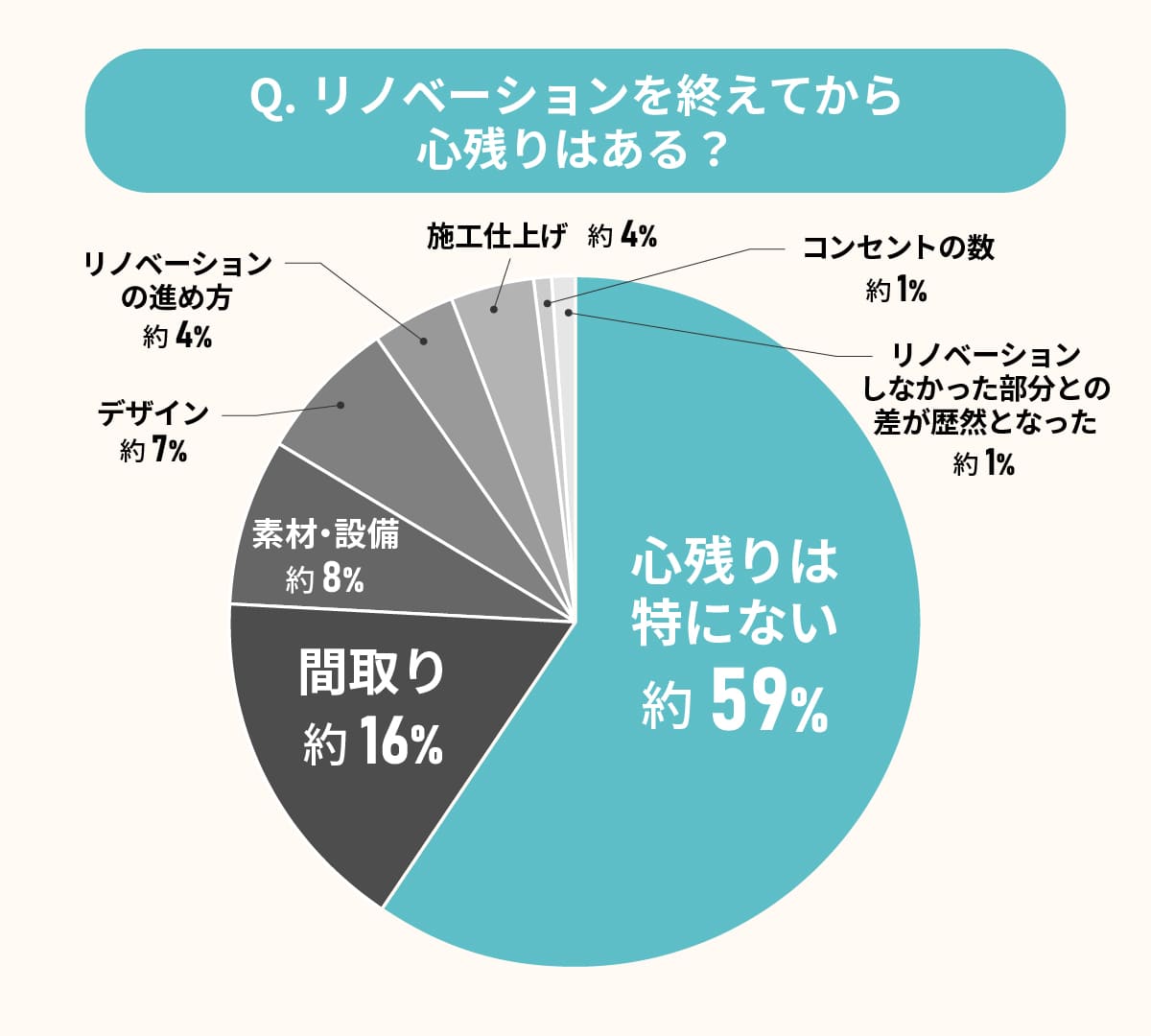 回答者に、リノベーションを終えてからの心残りがあるかどうかや、不満だったことを聞いてみました。