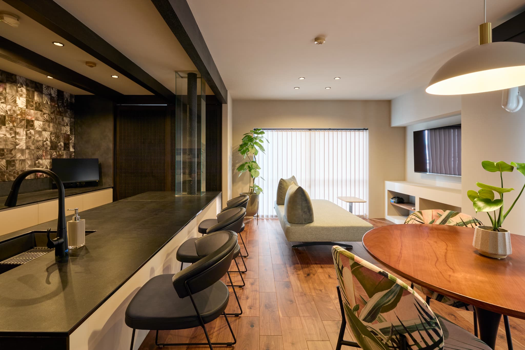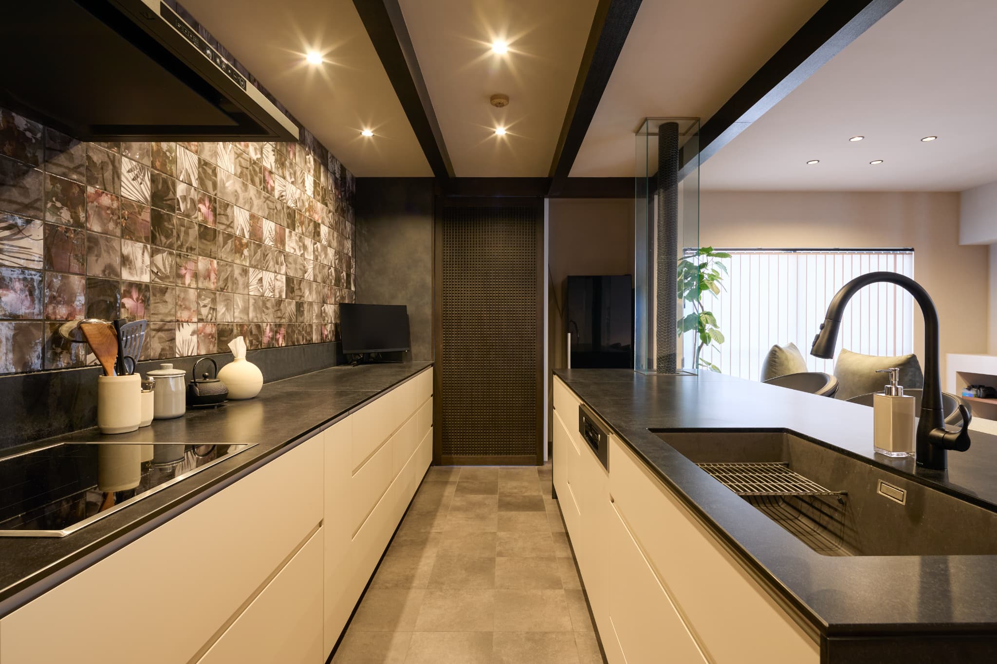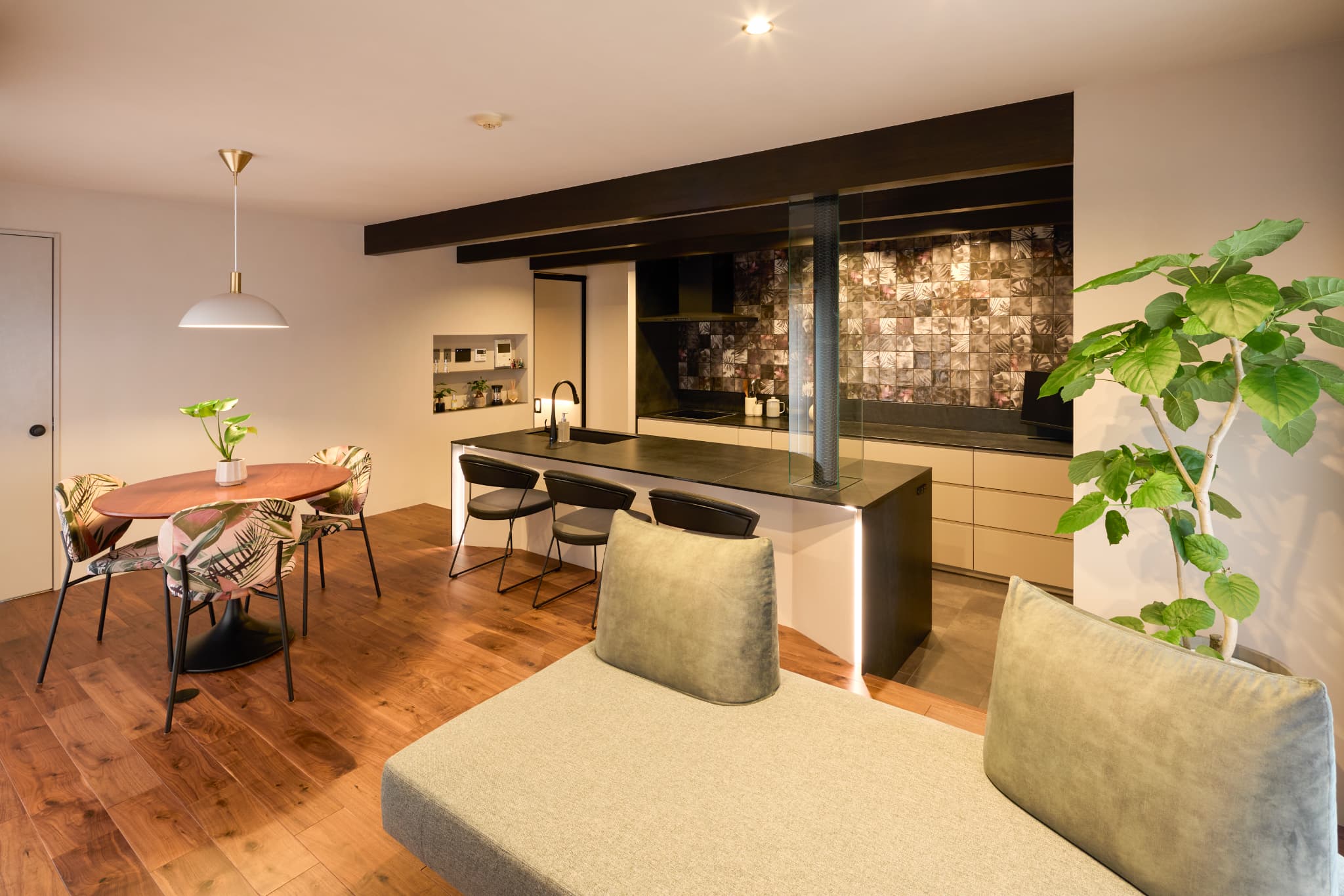 合計6mを超える大きなⅡ型キッチンで、広々とした作業スペースを確保。海外製食洗機やディスポーザーなど機能性も充実しています。背面のランダムなボタニカル柄タイルがアクセントとなり、デザイン性と使いやすさを兼ね備えたキッチンです。