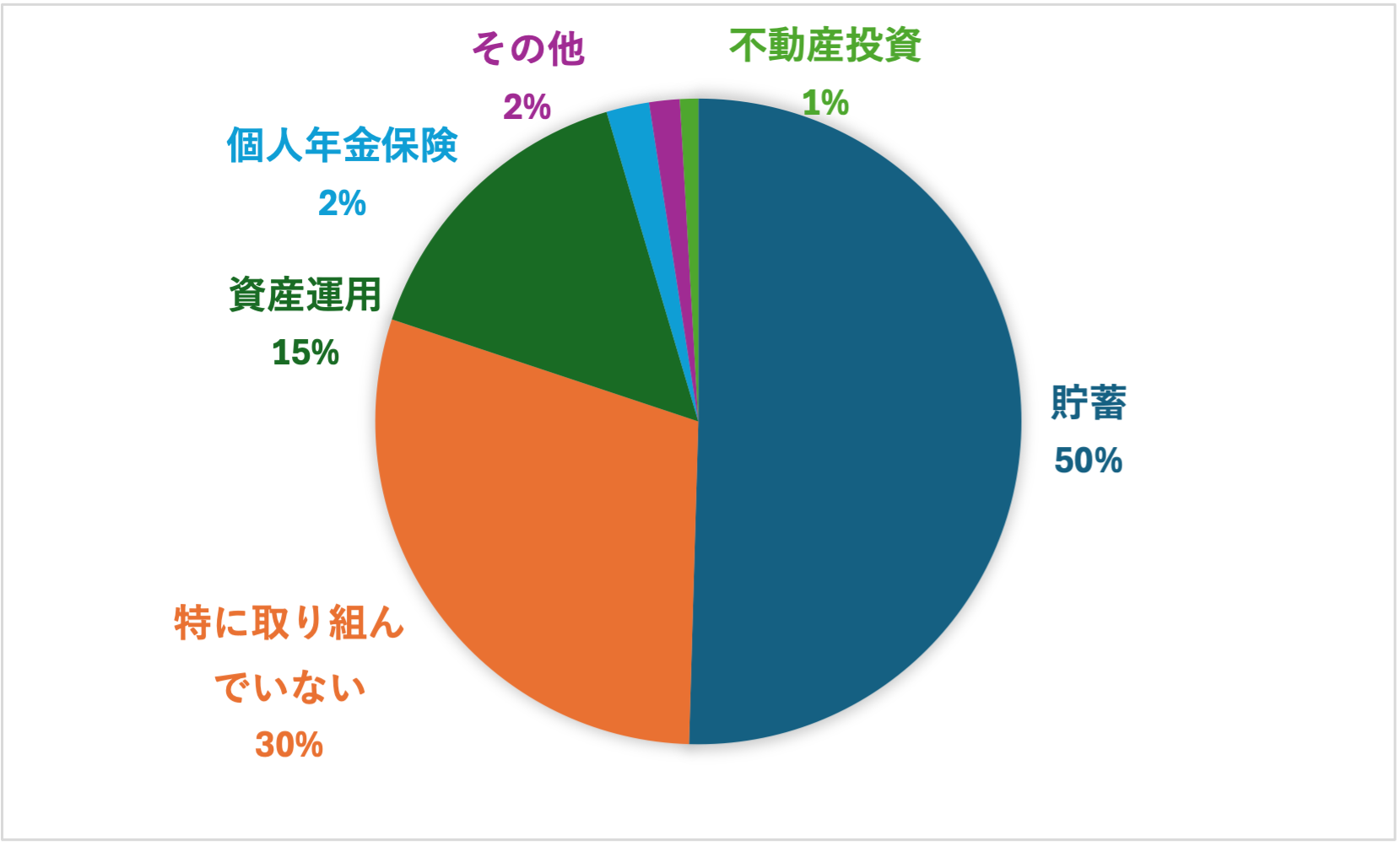 現在の資産形成や将来の準備のために実施していることは「貯蓄」と回答した方が50%でした。一方「資産運用」と回答した方は15%でした。