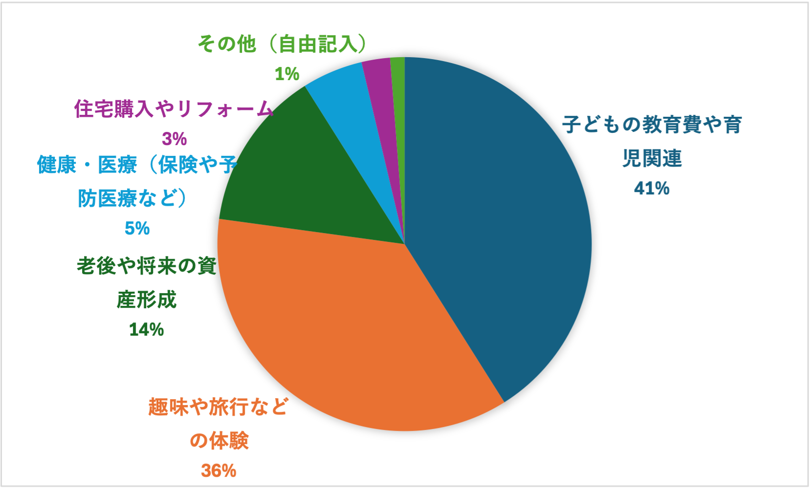 特にお金をかけたいと考えている分野で「子どもの教育費や育児関連」と回答の方が41%でした。「老後や将来の資産形成」と回答の方は14%、「住宅購入やリフォーム」と回答の方は3%でした。