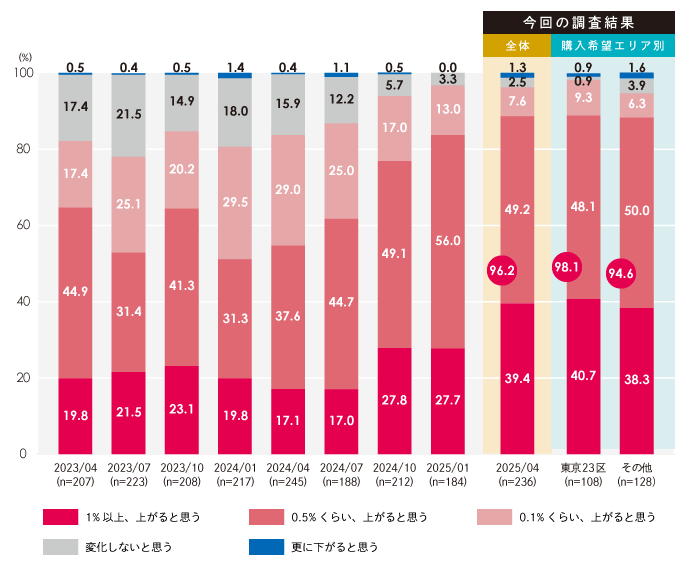 一方で、変動金利の今後の動向に関する見通しについても調査を実施したところ、「今後、変動金利は上昇すると思うか」という設問に対し、96.2%の方が「少なくとも0.1%以上は上がると思う」と回答しました。将来的な金利上昇リスクに対する警戒感が高まっている様子がうかがえます。