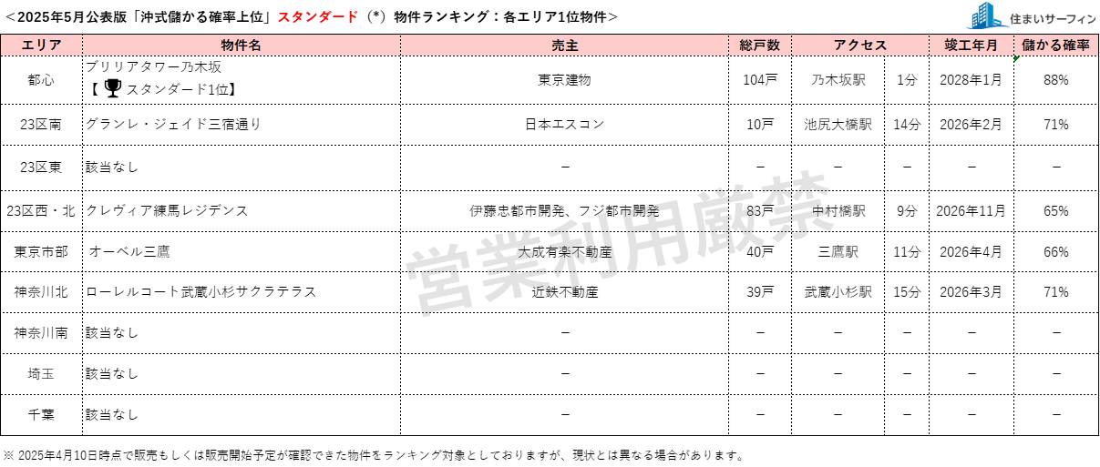 昨今のマンション価格の高騰を受け、購入検討時に資産性を重視する消費者の割合が高まりつつあります。このような社会動向と消費者ニーズをふまえ、「住まいサーフィン」では資産性を重視したマンション選びの支援を目的に、首都圏のマンションを「沖式儲かる確率」の高い順にランキング化し、毎月発表しています。対象物件は、首都圏で販売中および販売予定のマンションで、本リリースでは9エリアにおける“スタンダード(*)”物件と“家活(*)”物件それぞれ1位の物件のみを公表しています。