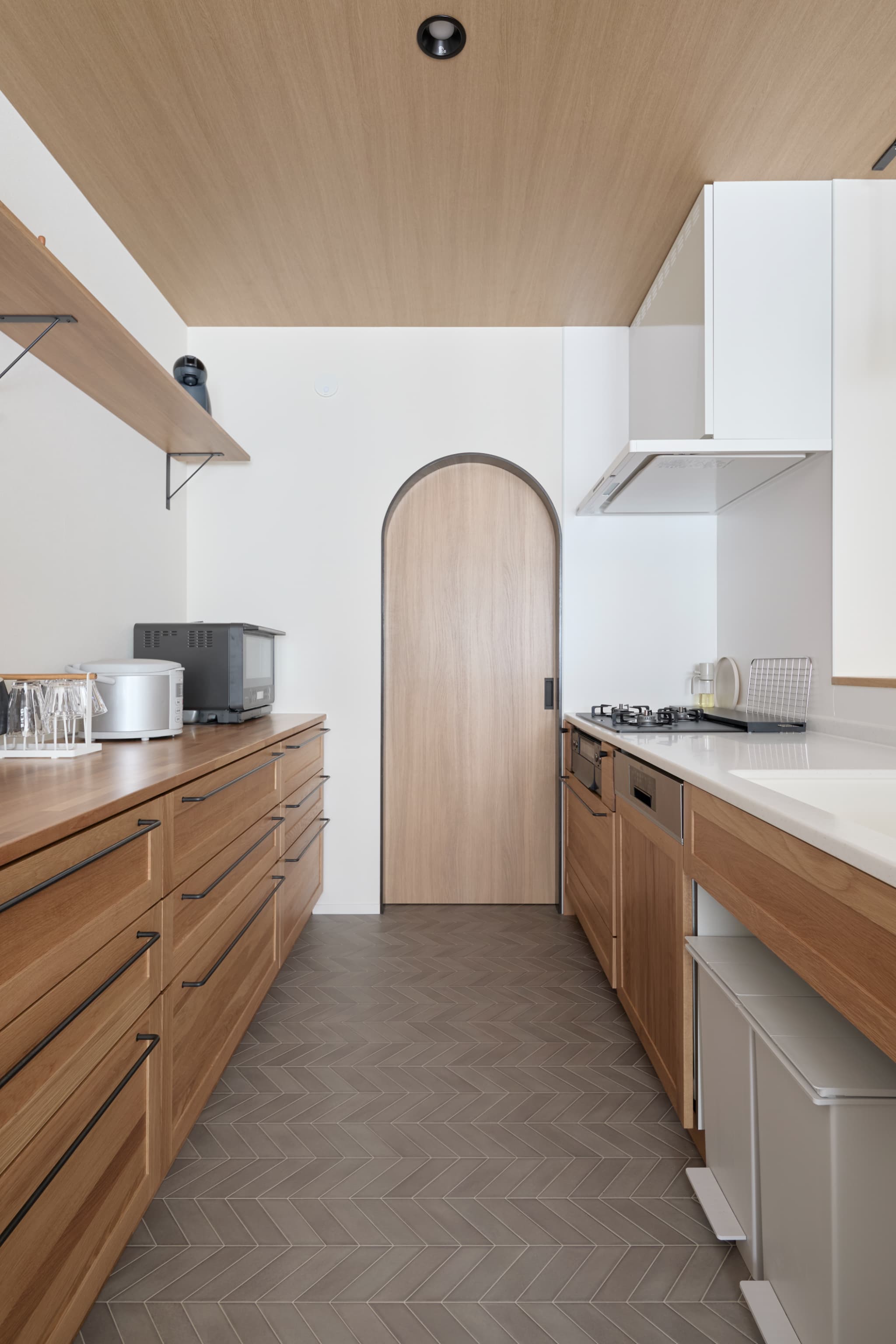 オークやラタンを使った建具や家具、柔らかな色彩で統一された空間は、まるでお気に入りのカフェにいるような心地よさ。タンバリン柄のタイルやデイジーの壁紙など、さりげない遊び心も暮らしに彩りを添えています。