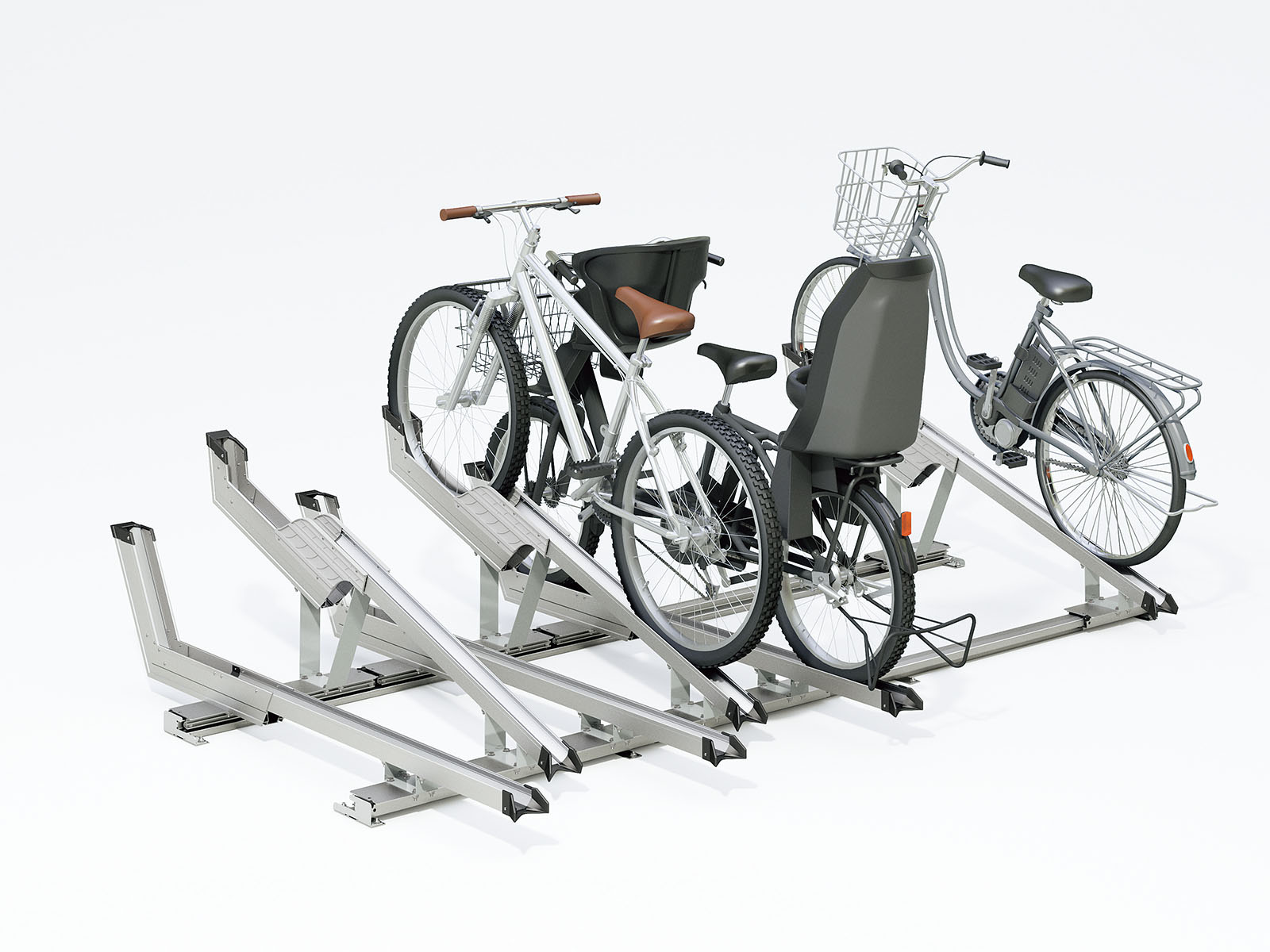 2段式自転車ラックの上段用ラック「TC-SRGF型」「TC-SRGF2型」450mmピッチ仕様。上段には2段式ラック、下段にはスライド式ラックという複雑な組み合わせの見積りも可能。