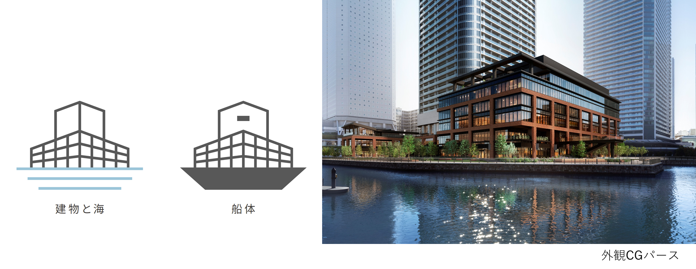 ロゴタイプは、横浜開港の歴史を感じさせるクラシックな書体をベースに、船が海を進む時に生まれる航跡波をイメージしたアクセントを組み合わせ、横浜の未来へと船が進む姿を表現しています。ロゴマークは、海側から見た建物を前進する「船」に見立て、本事業が歴史ある地で新しい横浜を切り拓いていくイメージを表現しています。