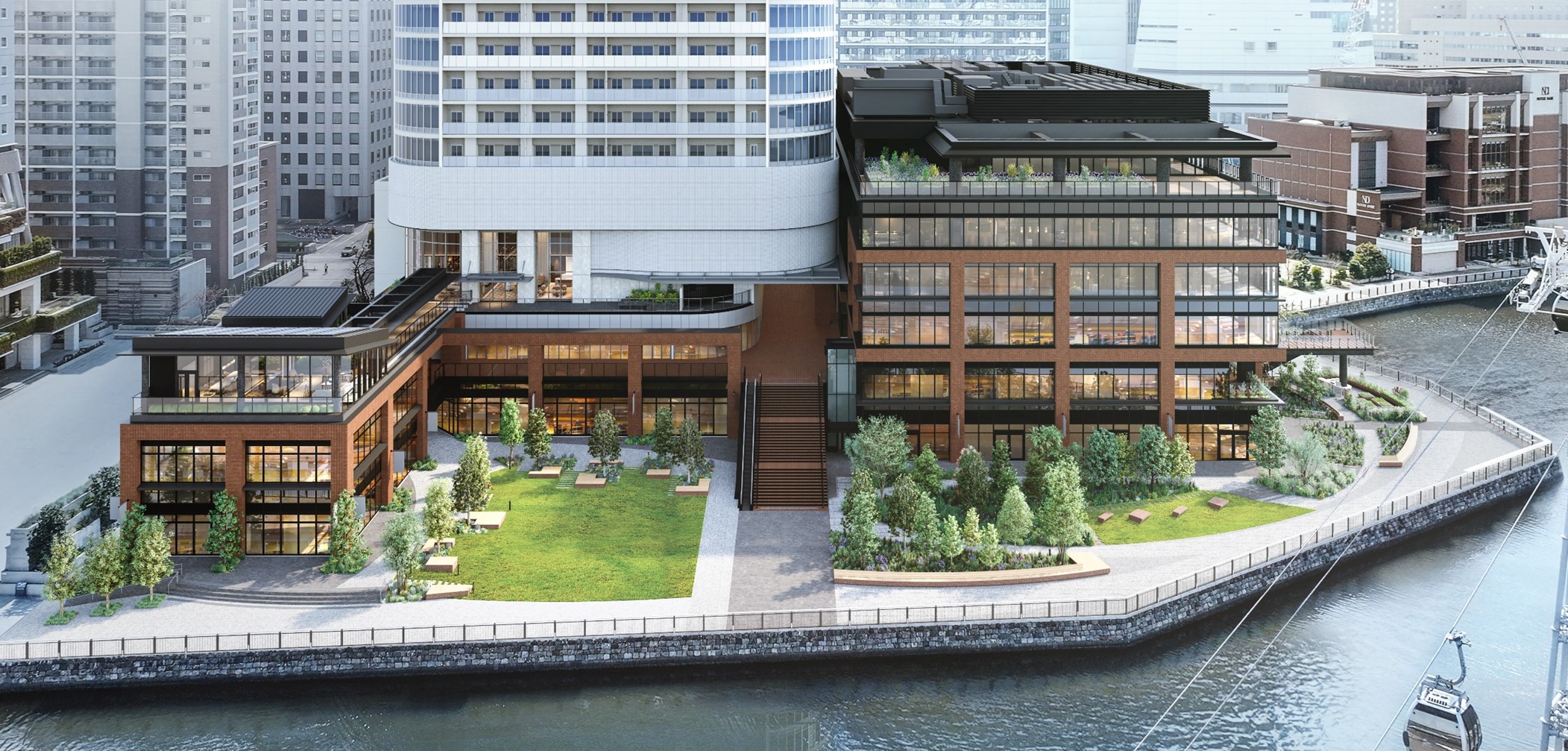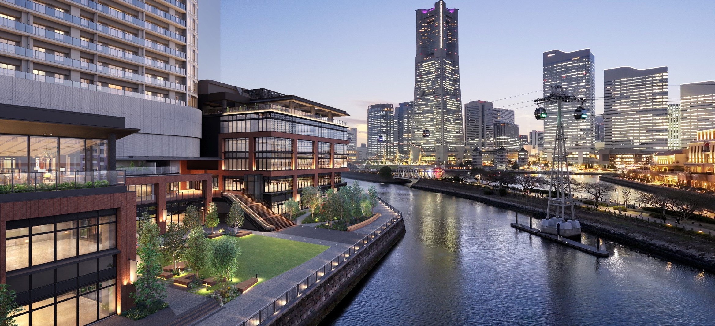 本事業は、みなとみらい線「馬車道」駅より徒歩約2分に位置し、二方が海に囲まれるウォーターフロントと呼ぶにふさわしい立地に誕生する大型複合開発事業となります。敷地内には運河沿いにプロムナードや約3,200㎡からなる広場を設けるほか、建物1階から2階に位置する低層部商業ゾーンは、運河沿いの開放的な環境と上質な時間を楽しめる約4,300㎡規模の飲食店舗、サービス店舗などが開業予定です。2階から6階に位置する、基準階面積 約740坪の大フロアを有するオフィスゾーンは横浜の海と広場を近くに感じられる眺望の中、利用者の健康性、快適性の維持・増進を支援する建物としてCASBEEスマートウェルネスオフィス認証を取得予定です。40階建ての住宅棟は横浜の景色を一望することができ、更に曲線美を描いたタワーは際立つフォルムにより横浜の新たなアイコンとなるデザインを目指しました。