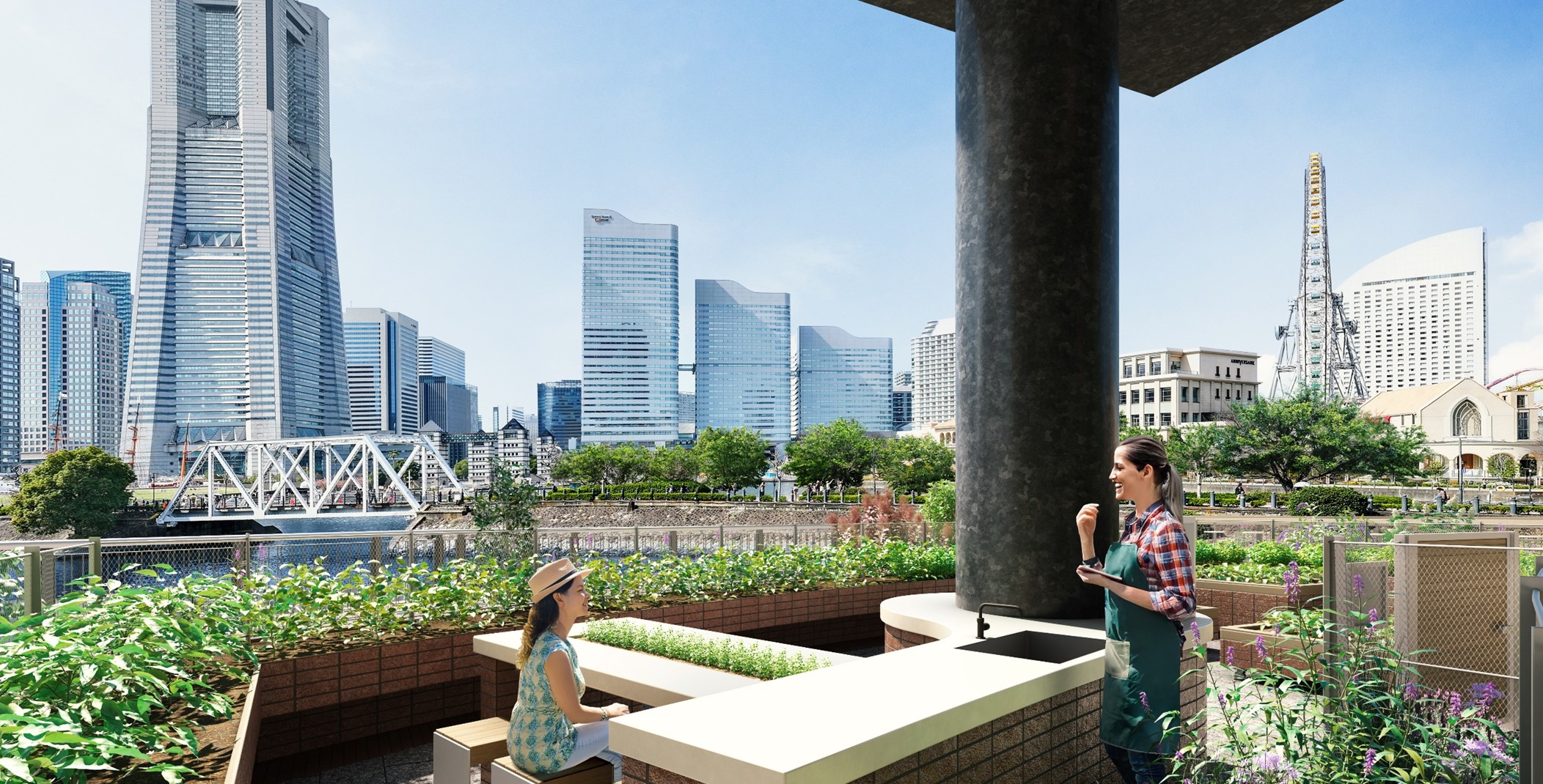 西側のランドスケープには、街区や周辺に住まう方、働く方など、様々な方が利用出来るシェア型農園を計画しています。横浜随一の眺望を楽しめる特別な場所で、「農」や「食」といった誰にも通じる共通のテーマをきっかけに地域の緩やかなつながりを生み出し、水辺のステージの一つとしてこの場所らしいライフスタイルを提案します。