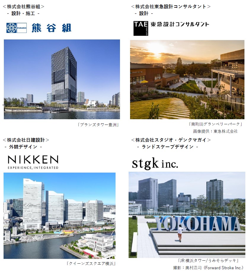建物の設計は熊谷組・東急設計コンサルタント設計共同企業体、施工は熊谷組が担当し、設計・施工の一貫体制・技術開発力により高い品質を実現します。外観デザインは日建設計が担当し、横浜の街並みやスカイラインに調和しながらも際立つアイコニックな造形を創出します。ランドスケープデザインは横浜で数多くの実績を誇るスタジオ・ゲンクマガイが担当し、護岸沿いの敷地を活かしたランドスケープの工夫が随所に凝らされています。