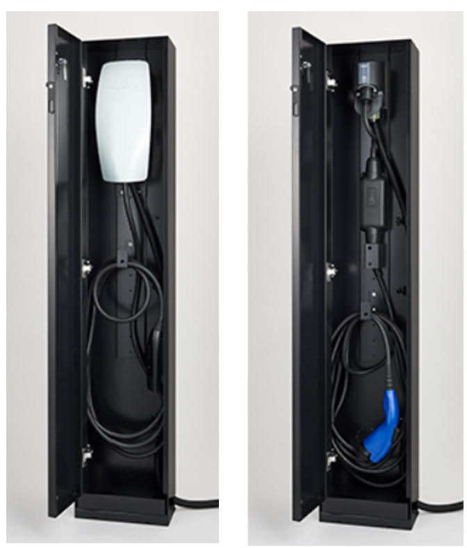 庫内の広さは主要メーカーのEV充電器に対応しており、床置き・壁付けいずれの方法でも設置が可能です。コンセント型充電器はもちろん、テスラ社のウォール型充電器も内蔵可能です。