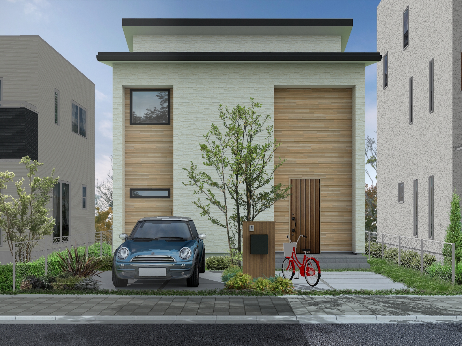 【外観】片流れとBOXの3フォルム 1,2階連続の斜め袖壁が際立つデザイン性が高い外観
