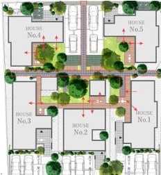 全邸敷地面積50坪以上の区画を有した5邸の庭をまとめて設計することによって一体的な中庭を形成しました。各邸から眺めることができるため、庭と居住空間との心地良いつながりを創出しています。フェンスや植栽の配置を工夫することによって、お互いの室内に視線が入らないようになっており、いつでも開放的な庭を楽しむことができます。