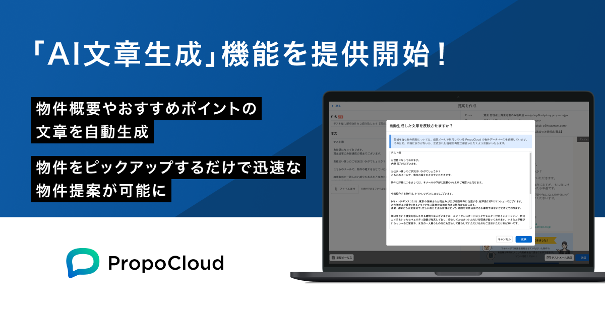 テクノロジーで不動産取引をなめらかにするイタンジ株式会社のグループ会社である、株式会社Housmart(以下「ハウスマート」)は、2025年5月13日より、不動産売買仲介会社(以下「仲介会社」)向け追客支援システム「PropoCloud(プロポクラウド)追客支援」に物件購入希望者(以下「買主」)へのメールの文章を自動作成する「AI文章生成」機能(以下「本機能」)を追加いたします。これにより「プロポクラウド 追客支援」を利用する仲介会社は、提案したい物件を選択するだけで、物件概要やおすすめポイントをわかりやすく説明する文章が自動で生成され、迅速な物件提案メールの作成が可能になります。