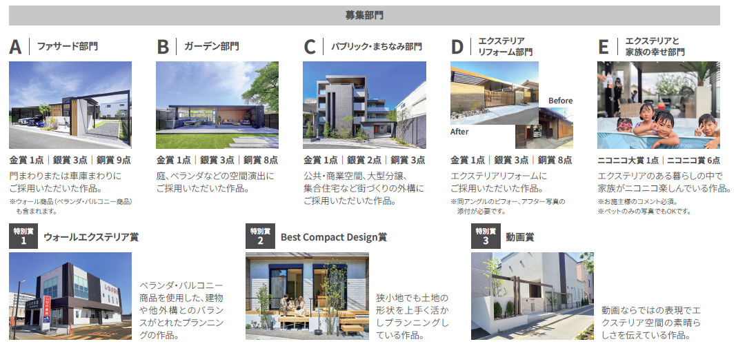 2025年の募集部門は、「ファサード部門」、「ガーデン部門」、「パブリック・まちなみ部門」、「エクステリア リフォーム部門」、そしてエクステリアのある暮らしの中でお施主さまやご家族が楽しんでいる写真を応募いただく「エクステリアと家族の幸せ部門」の計5部門です。