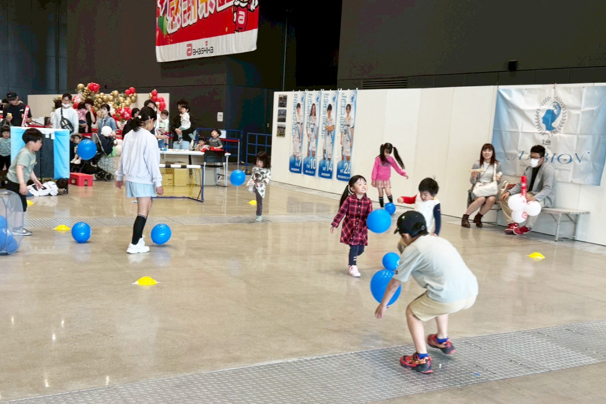 風船を使った3対3の家族対抗ミニゲームを実施。子どもから大人まで白熱した試合が繰り広げられ、大きな歓声が響きました。また、3×3マスの穴にボールを入れるゲームを「サッカービンゴ」を併催。ボールが穴に入るたびに歓声が上がりました。