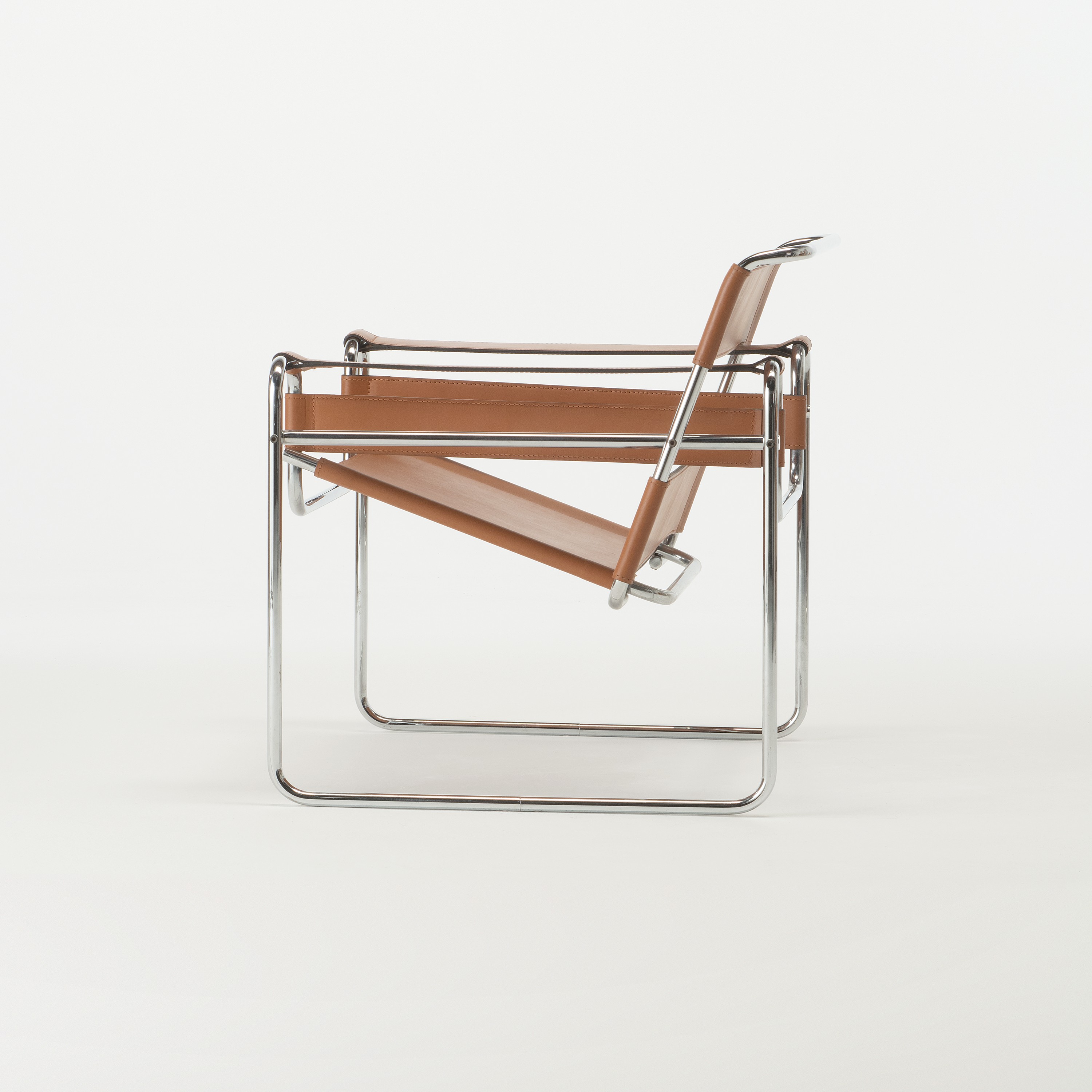 ワシリーチェアは、スチールパイプを使用した世界最初の椅子で、モダニズムデザインの先駆けとなった名作椅子です。革新的なアイデアのヒントは、ブロイヤーが手に入れた、アドラー社の自転車用ハンドルでした。しかし当時はパイプを曲げる技術が確立されていなかったため、苦労の末に誕生しました。曲げ加工したスチールパイプをフレームとし、背、座、肘かけに革を張るだけのシンプルかつ無駄のないデザインは、座ると体が浮いているような心地よさが感じられます。ブロイヤーはこの時期に鋼管を使用した家具を数多くデザインしており、家具の素材として鋼管を使用したパイオニアです。