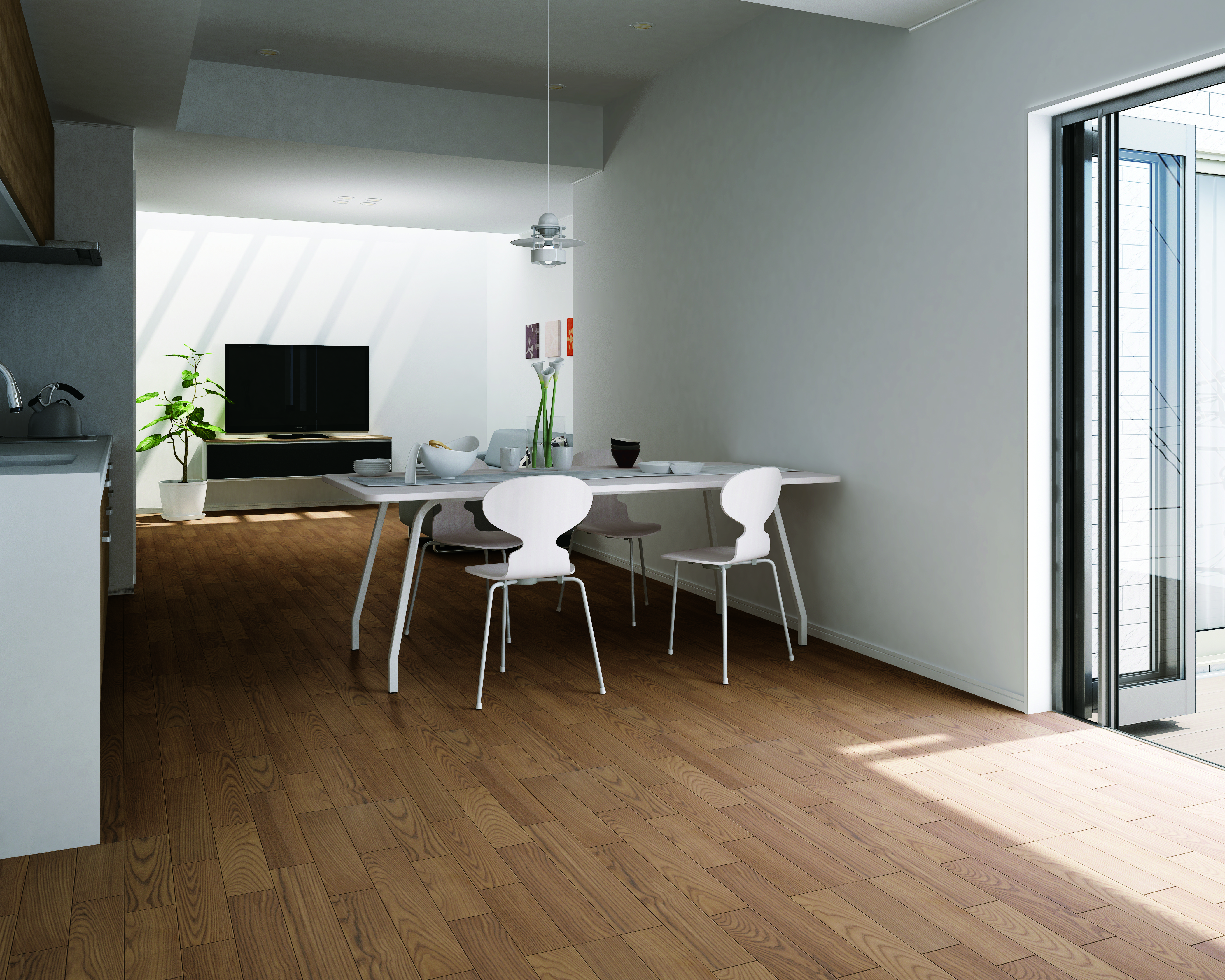 今回発売する『ジオラスタンダード』も、「Eハードベース」を用いたWPC床材として、環境配慮型床材のラインアップ拡充に貢献する新製品であり、また、高級グレード床材のさらなる拡販を図るため、6月発売予定の新内装シリーズ『イエリア』の建具ともコーディネートしやすいカラーバリエーションを取り揃えました。