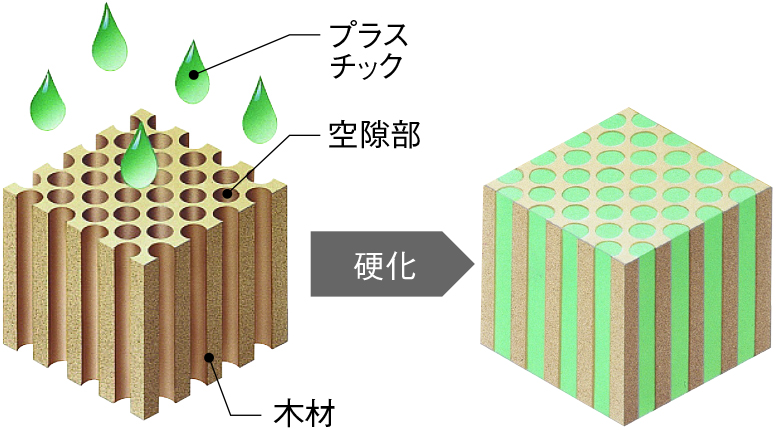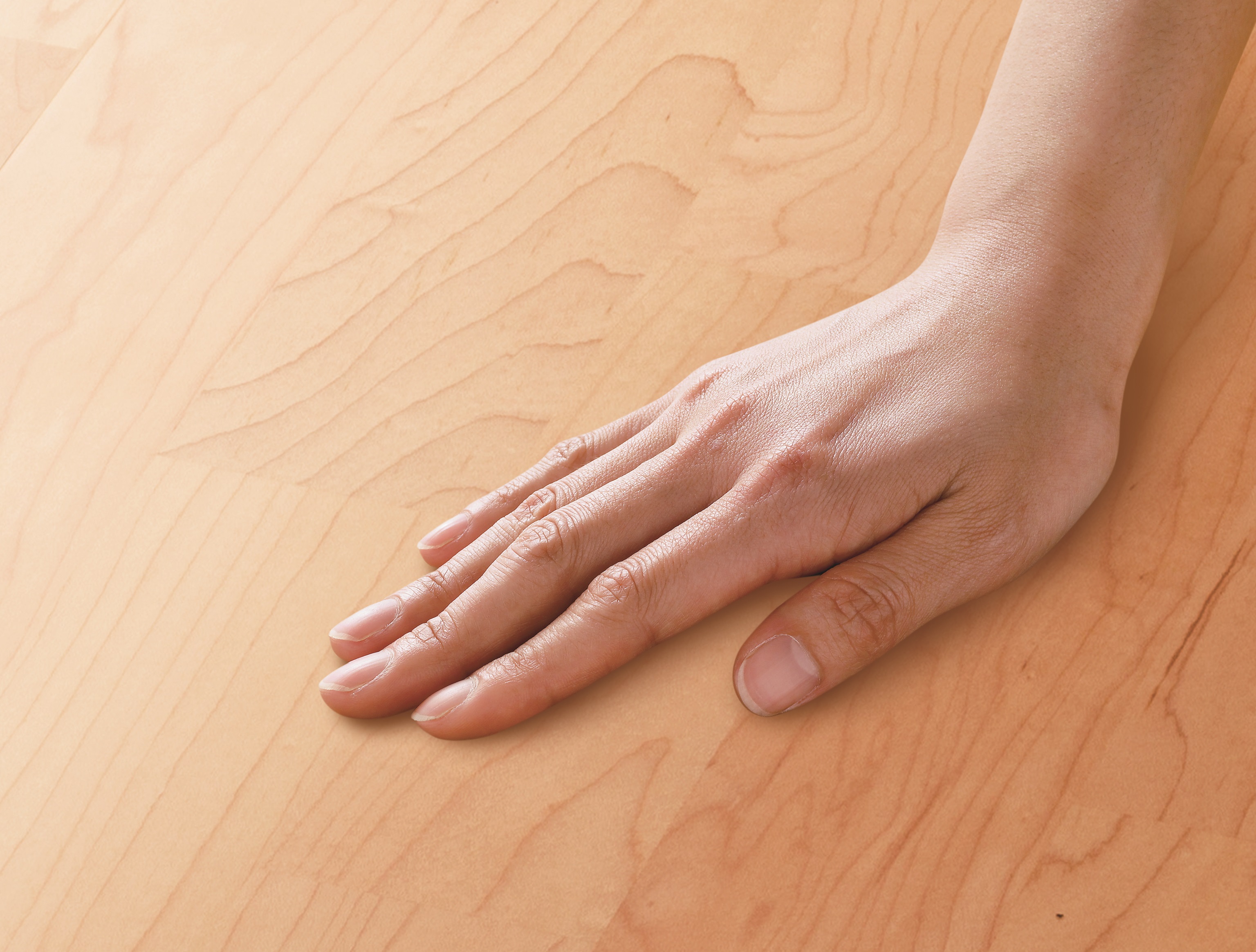 床材の表面化粧材に当社独自のWPC加工を施すことにより、天然木が持つ自然な美しさや風合いはそのままに、高い表面強度を実現。キャスター付きイスや車イスなどによる傷や凹みに強いほか、水がかりにも強く、優れた耐久性を発揮します。