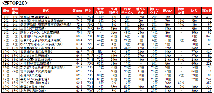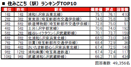 1位は5年連続で、さいたま市浦和区に位置する浦和(JR京浜東北線)です。2位は、さいたま市北区に位置する東宮原(埼玉新都市交通伊奈線)で、昨年3位から一つ順位を上げました。3位は、さいたま市大宮区に位置する鉄道博物館(埼玉新都市交通伊奈線)で、昨年6位から順位を上げてトップ3入りしています。トップ10内では、さいたま市緑区に位置する9位の浦和美園(埼玉高速鉄道)が昨年12位から順位を上げてランクインしています。