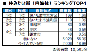 トップ2は3年連続で、1位はさいたま市大宮区、2位はさいたま市浦和区です。3位は、2年連続で川越市です。4位は同率タイで、昨年から2年連続でのランクインとなる東京都港区と、昨年7位から順位を上げた神奈川県鎌倉市です。