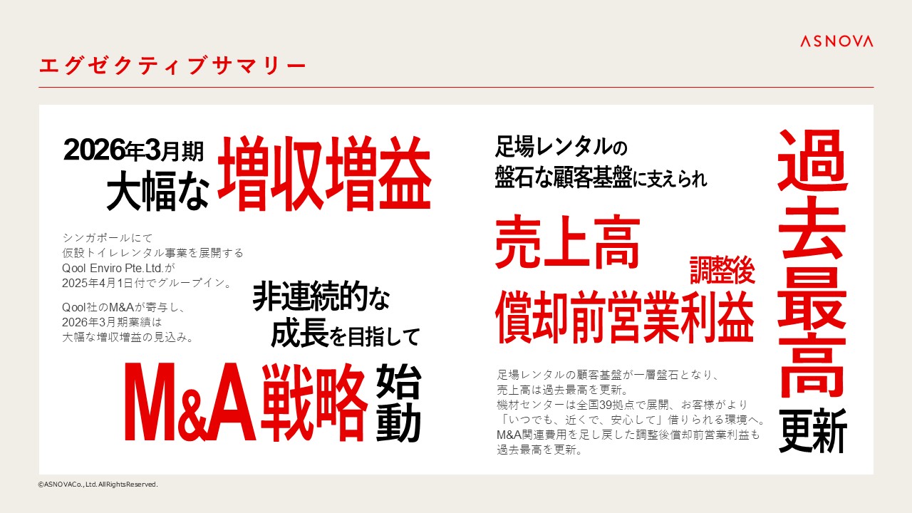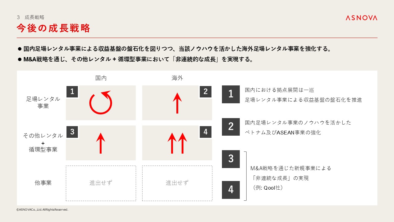 特にASEAN市場を主とした海外でのレンタル事業会社へのM&Aを加速し、2030年のありたい姿の実現を目指したいと考えております。一方で、進出しない領域も明確にし、M&Aに対するポリシーを大切にしながら、投資を実行してまいります。