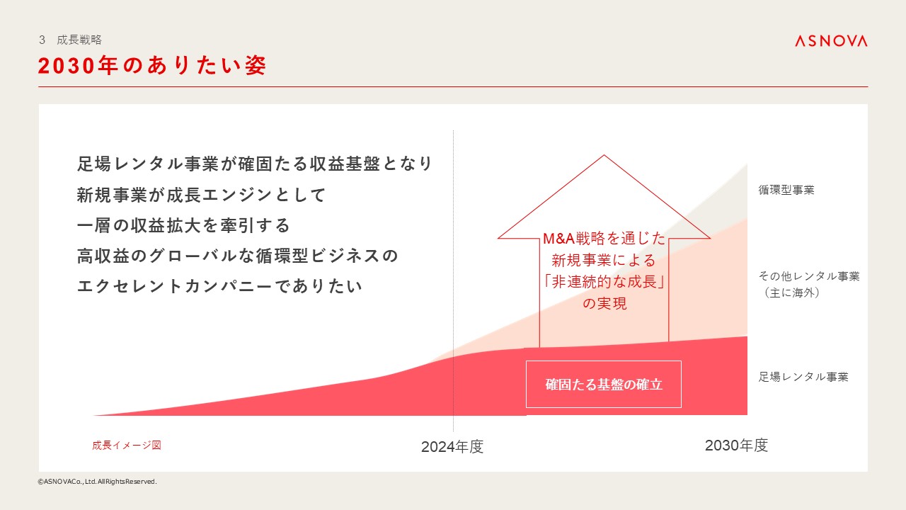 「足場レンタル事業が確固たる収益基盤となり、新規事業が成長エンジンとして一層の収益拡大を牽引する、高収益のグローバルな循環型ビジネスのエクセレントカンパニーでありたい」です。