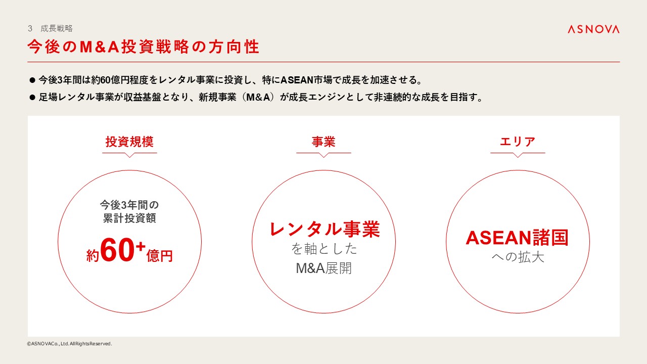 今後3年間は特にレンタル事業を軸に、ASEAN市場において積極的なM&A投資を行い、さらなる成長の加速を図ってまいります。
