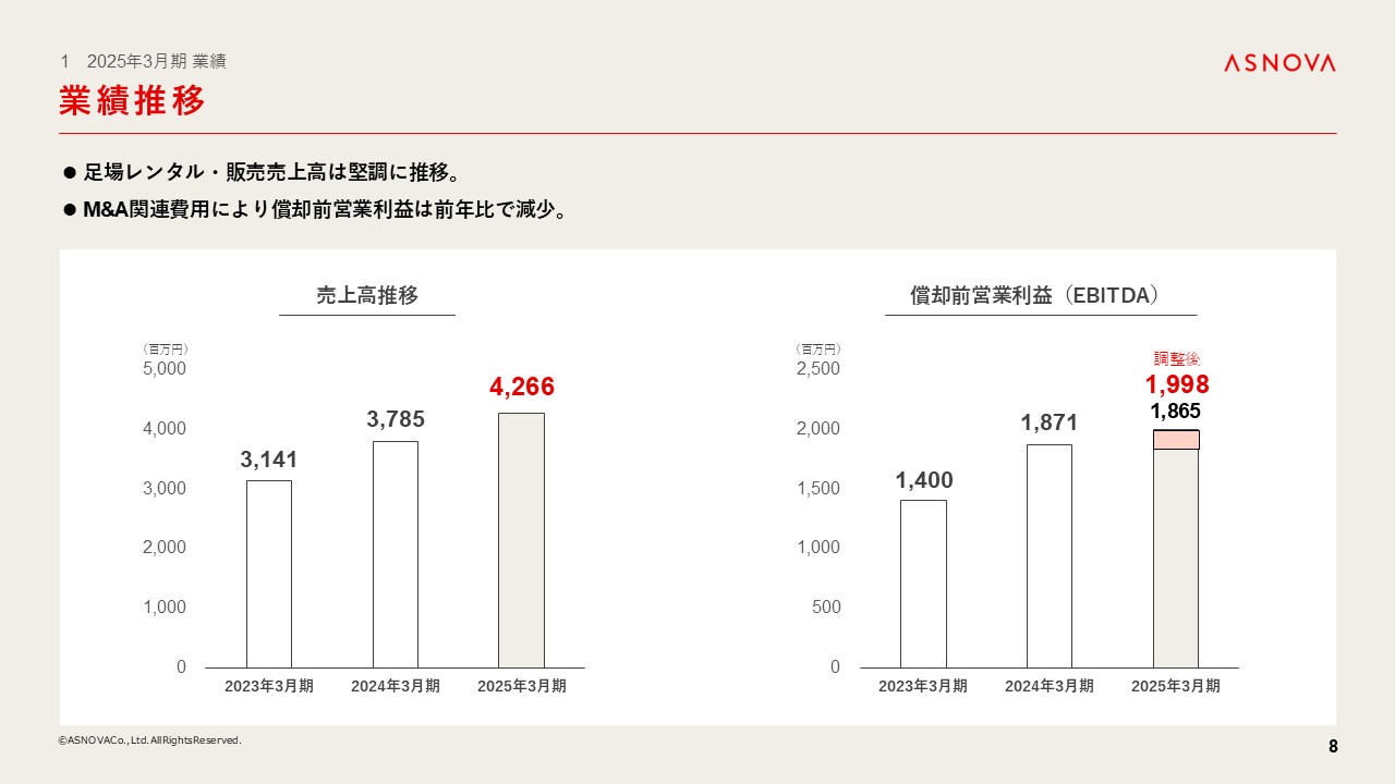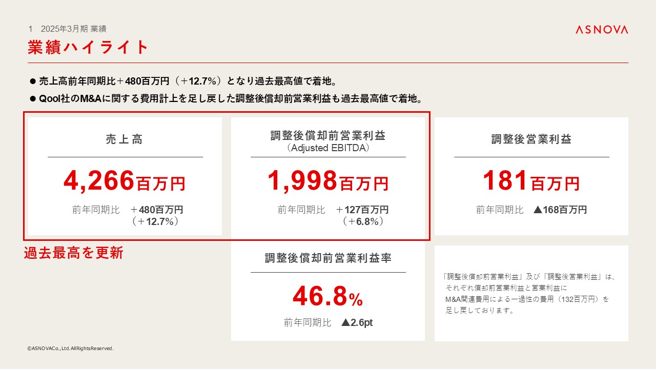 ④ 2025年3月期につきましては、売上高および調整後の償却前営業利益は過去最高となりました。