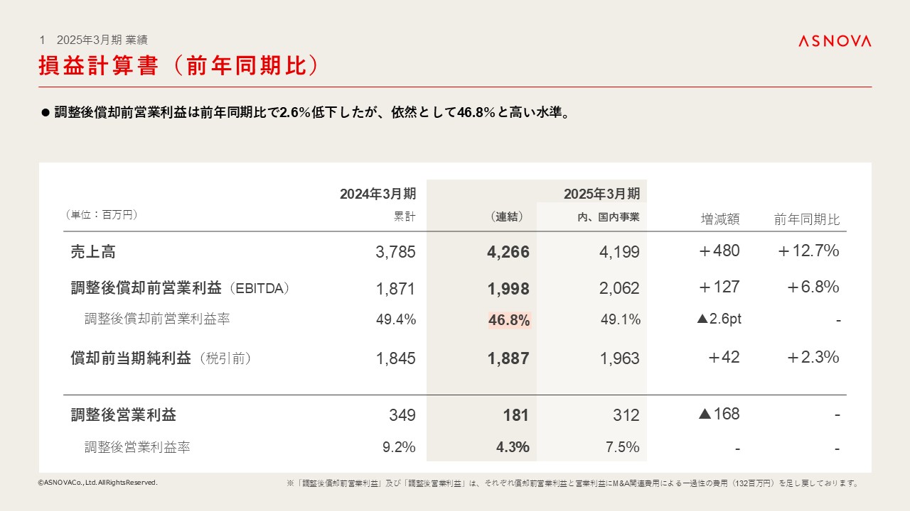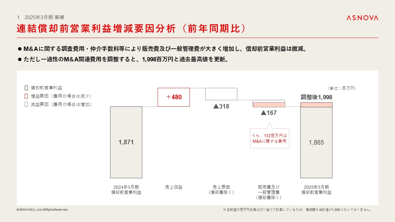 M&Aに関する調査費用および仲介手数料等により販管費が大きく増加し、償却前営業利益はわずかに減少いたしました。ただし、一過性のM&A関連費用を調整した場合、償却前営業利益は1,998百万円となり、過去最高値を更新しております。
